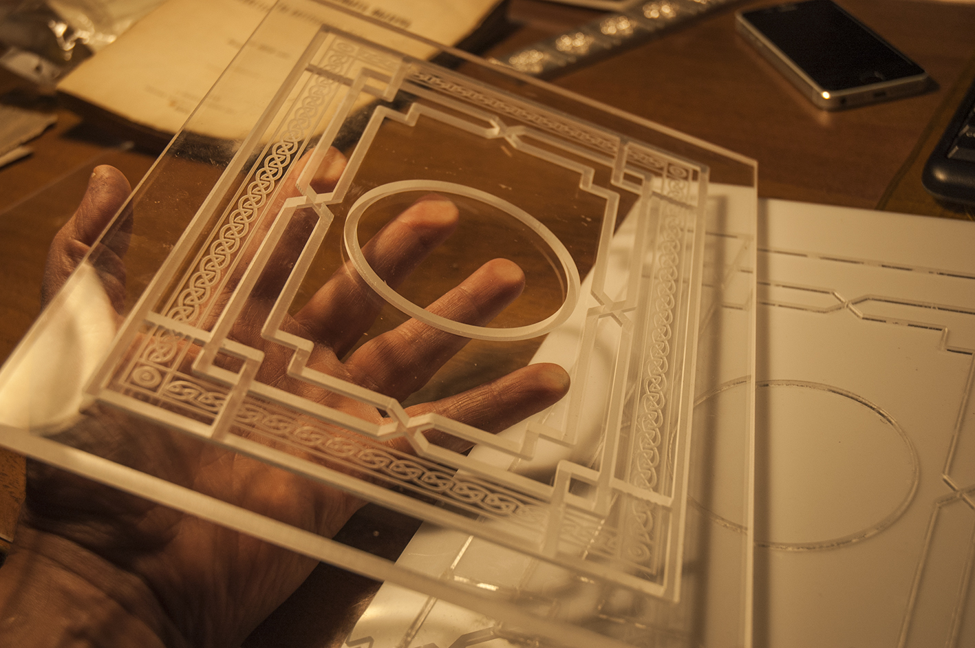 Ув. N.Kushnir, Маму делал так: толщина акрила 8 мм. глубина фрезеровки толстой канавки -3 мм. глубина орнамента-1 мм Папа - вы правильно заметили - от ширины канавки в маме уменьшил на толщину кожи 2 мм .Папу выфрезеровал из акрила толщиной 2мм по вектору и приклеил к основе СА-12 .( На фото все вид...