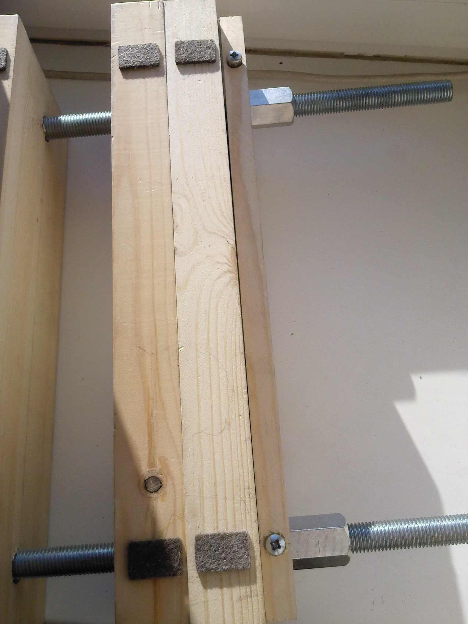 Тиски, сделаны из ступени, которая была куплена в строительном магазине, и распилена на 4 равные части, чтобы закручивать с одной стороны, сделал фиксатор с другой стороны в виде болтов диаметром "6", использовалось сверло диаметром 5, и метчик, ручки сделаны от использованных раннее наборов резаков по дереву, шпильки диаметром 20, и гайки под ключ 30.Цена вопроса Ступень -400р, Шпилька -примерно 100-200р, 4 гайки -130р(каждая), болты диаметр 6 -4шт , шайбы -4шт, сверло по металлу диаметр 5, метчик, сверло по дереву для отверстий под шпильки диаметром 20,кстати самым сложным оказалось сверление отверстий и соблюдения соосности. Вот строительном был бесплатный распил, где и удалось четвертовать ступень идеально ровно, а вот сверления не было что оказалось бы очень хорошо, а так мучения и пришлось выцеливать, но кое как получилось(природная упертость и смекалка здесь просто необходимы),т.к. толщина брусков значительная.Ссылаясь на свой уже давно приобретенный опыт сверление этих самых отверстий(когда то работал в мебельном производстве), без вертикального сверлильного станка, было просто авантюрой, и она к счастью удалась.Так что большую толщину сверлить лучше на спец оборудовании, в крупных строительных магазинах это услуга - сверления отверстий, должна быть, просто мне в тот день когда закупался, не свезло.