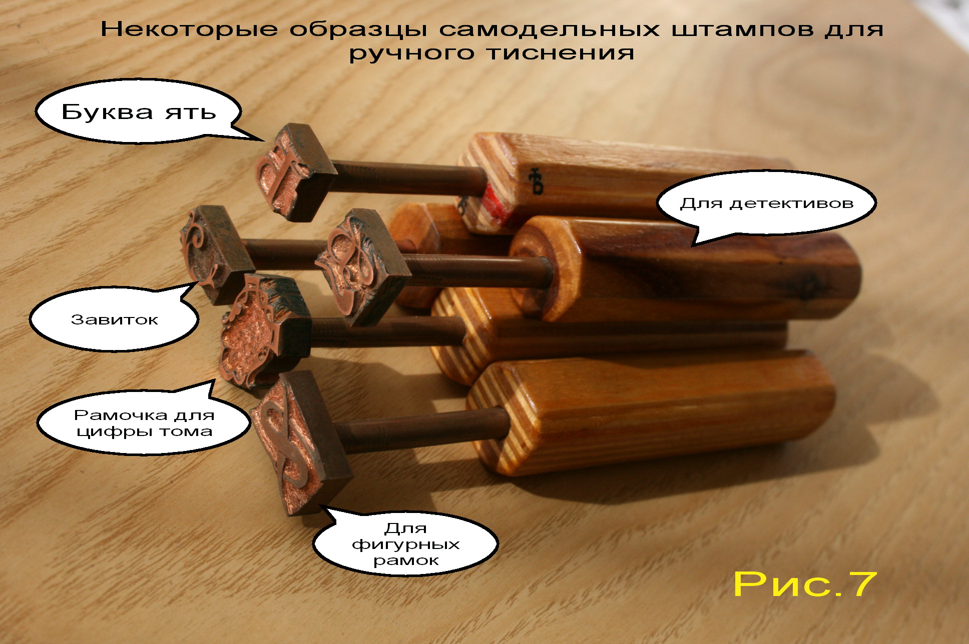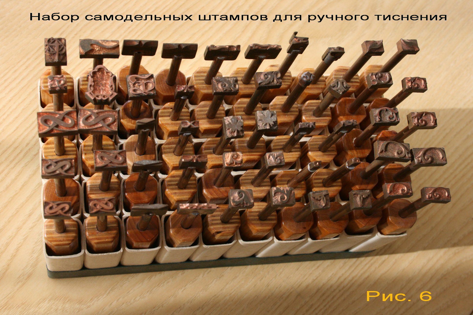 Технология очень проста. Всё гениальное просто. Деревянную ручку длиной 100 мм делаю отдельно. Ручка восьмигранная. Это не позволяет ей кататься по столу. Кроме того я могу одной рукой взять 3 или четыре штампа и перенести куда надо. С круглыми ручками как у Джонсона это не получится. Отказался от длинных ручек как у Джонсона. Не научился тиснить так, как рекомендует Джонсон. Сделал приспособу и тисню по линеечке.