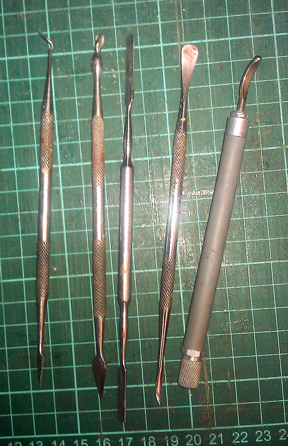 Что касается инструмента, то я довольно давно экспериментирую с лепкой миниатюр, и для этого в довольно далекие времена купил в московском "Детском мире" скульптурный инструмент (для кукольников). Выбор небогатый был, но для большинства операций хватает. Так вот сейчас он и в переплетных делах частенько помогает. На всех инструментах одна сторона острая (т.е. почти бесполезная), а вот вторая - скругленная. Диаметры разные, есть разные изгибы, так что смело могу рекомендовать. Наверняка, нечто подобное можно найти в сети. Прошу прощения за качество фото. Для скальпеля (с серой ручкой) есть еще несколько сменных наконечников для скульптурных дел, в том числе с маленькими шариками, ну и изначально он сделан под модельное лезвие №1. Покупался скальпель в магазине "Черная речка".