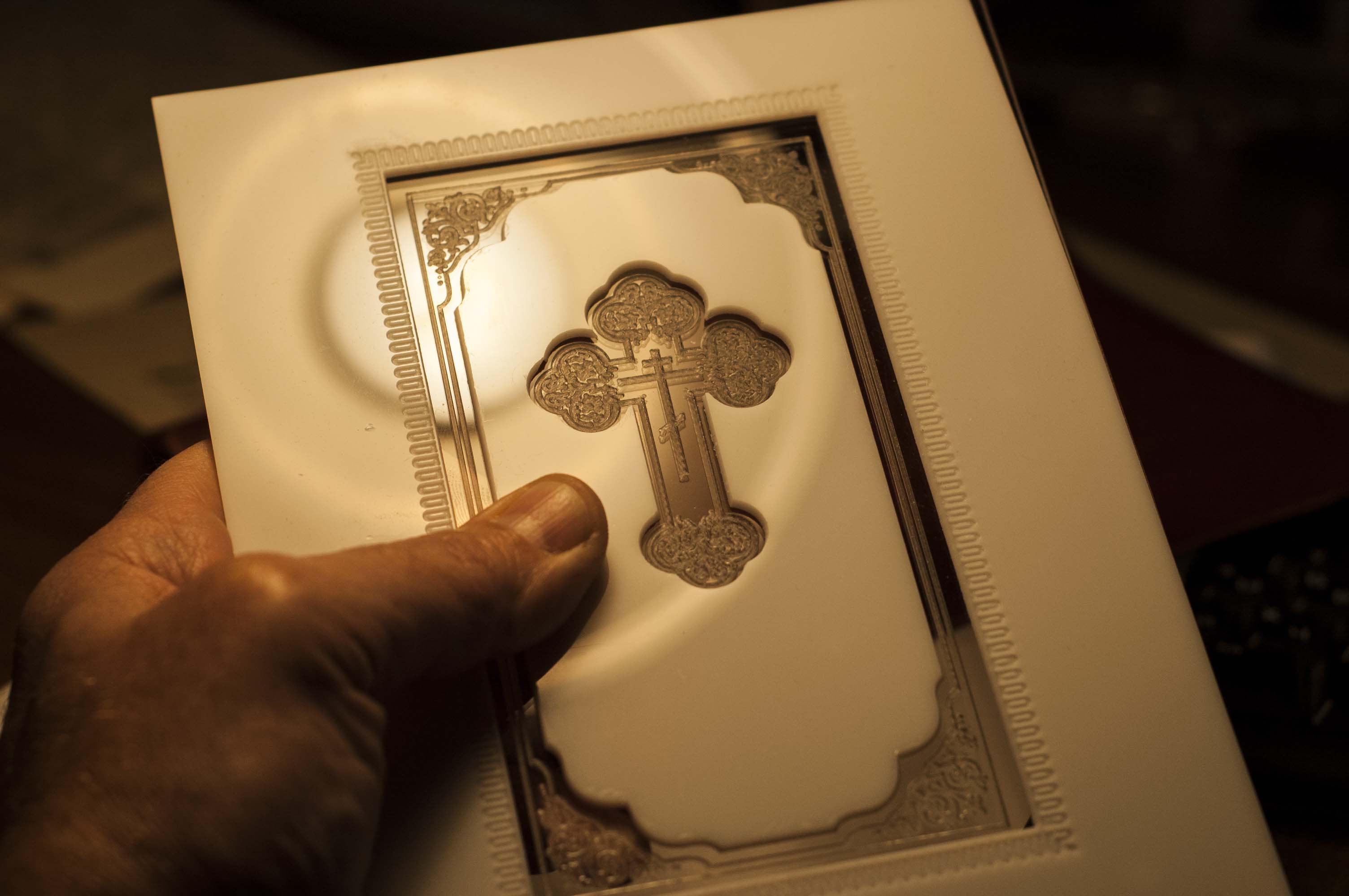 фрезеровка в акриле матрицы , крест и окантовку вырезал из картона и приклеил к сторонке, увлажнил кожу приклеил пва и в ручной пресс на сутки
