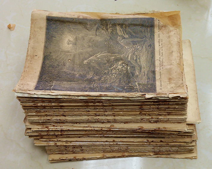 Выпадает блок тетрадей т.к. нарушено шитье в нижней части блока (там клей совсем осыпался). Верхняя часть держится хорошо проклейка почти целая. Для хозяина книга представляет определенную ценность. На мой взгляд важно, что нельзя точно установить возраст книги. Есть некоторый риск повредить бумагу при расклейке.