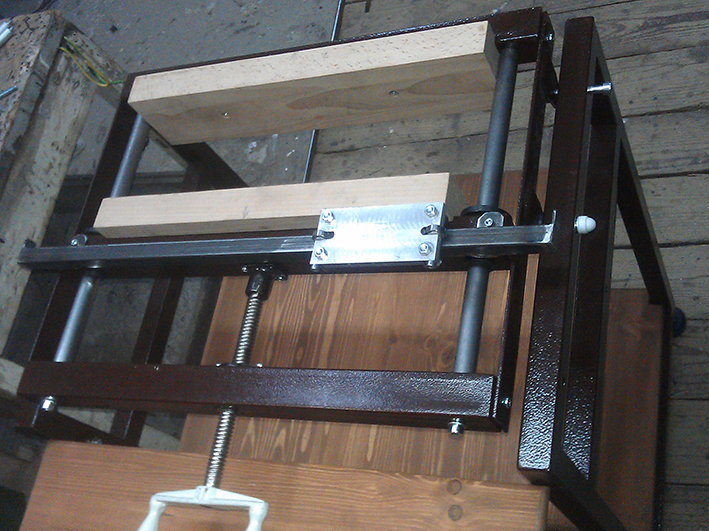 Вторя "щечка" горизонтальная, на ее нижней плоскости установлена алюминиевая каретка с шестью подшипниками, которые плотно устанавливаются на направляющую и обеспечивают плавный и безлюфтовый ход гобеля. Щечки соединены винтом (тоже на подшипнике) и двумя направляющими, сделанными из газ-лифтов, которые исключают возможность перекоса "щечек" при поджиме винта.