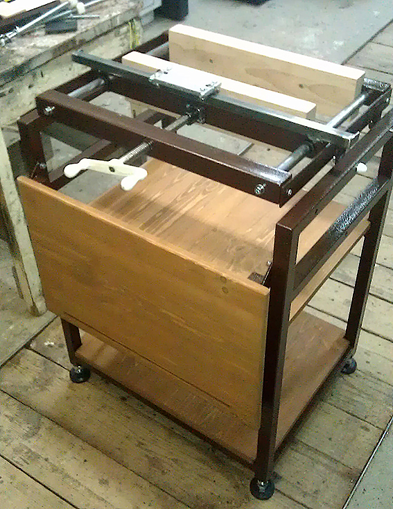Помаленьку городим "комбайн"... Выкладываю то, что готово на сегодняшний день (сразу приношу извинения за качество фоток). Станина с поворотными тисками и откидной столик для швального станка. На втором фото столик сложен, тиски в положении отделочных. На первом столик поднят, тиски в положении обжимных. Во всех положениях тиски жестко фиксируются. Готовы, но отсутствуют на фото: деревянные губки (из клееного бука) для тисков; 2 внутренних полки для принадлежностей (мебельный щит); винтовые стойки, верхняя перекладина, регулировочные гайки и покрытие столика швального станка. На очереди гобель.