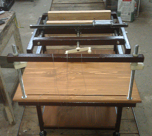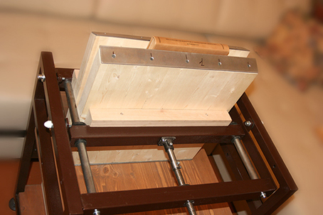 3. Обжимной пресс. Тиски переводятся в вертикальное положение, в котором фиксируются двумя винтами. Доски обжимного пресса сделаны из соснового щита (площадка для деревянных лестниц). Размеры пресса - 45 х 45 см. Нижняя плита просто укладывается на нижнюю деревянную "губку" тисков при помощи направляющих, верхняя через аналогичные направляющие фиксируется металлическими штифтами на верхней "губке". Ход винта - порядка 30 см (есть мысли впоследствии заменить на чуть более длинный - сейчас исходили из имеющегося в наличии, пришлось даже проставку делать, чтоб в положении гобеля тиски полностью зажимались).