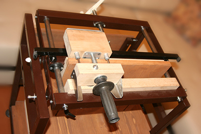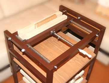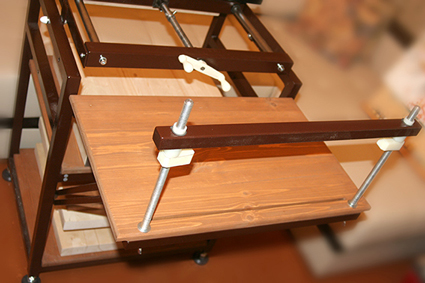2. Швальный станок. Столик откидывается на одной направляющей-упоре. Здесь немного "промахнулись" - логичнее упор было бы сделать на противоположной стороне, слева немного мешает посадке при шитье (некритично). Стойки сделаны из винтовой шпильки, вставляются в отверстия столика и закрепляются снизу "барашками". Сверху навинчены две капролоновые гайки, регулирующие высоту и натяжение шнуров. Шнуры вверху привязываются к поперечине, снизу фиксируются через прорезь в столике.