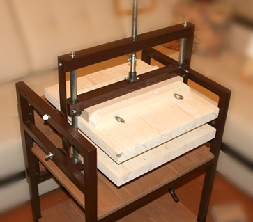 Да, все деревянные детали гобеля сделаны из букового подступенка (как и губки тисков). Из него же, скорее всего, будут сделаны плиты для обжимного пресса (немного потеряем в максимальной высоте стопы, но выиграем в прочности и равномерности прижима). Полки, столик швального станка и, скорее всего, шпальты - из соснового мебельного щита. Вкладыш для книжного блока в гобель - фанера 5 мм.