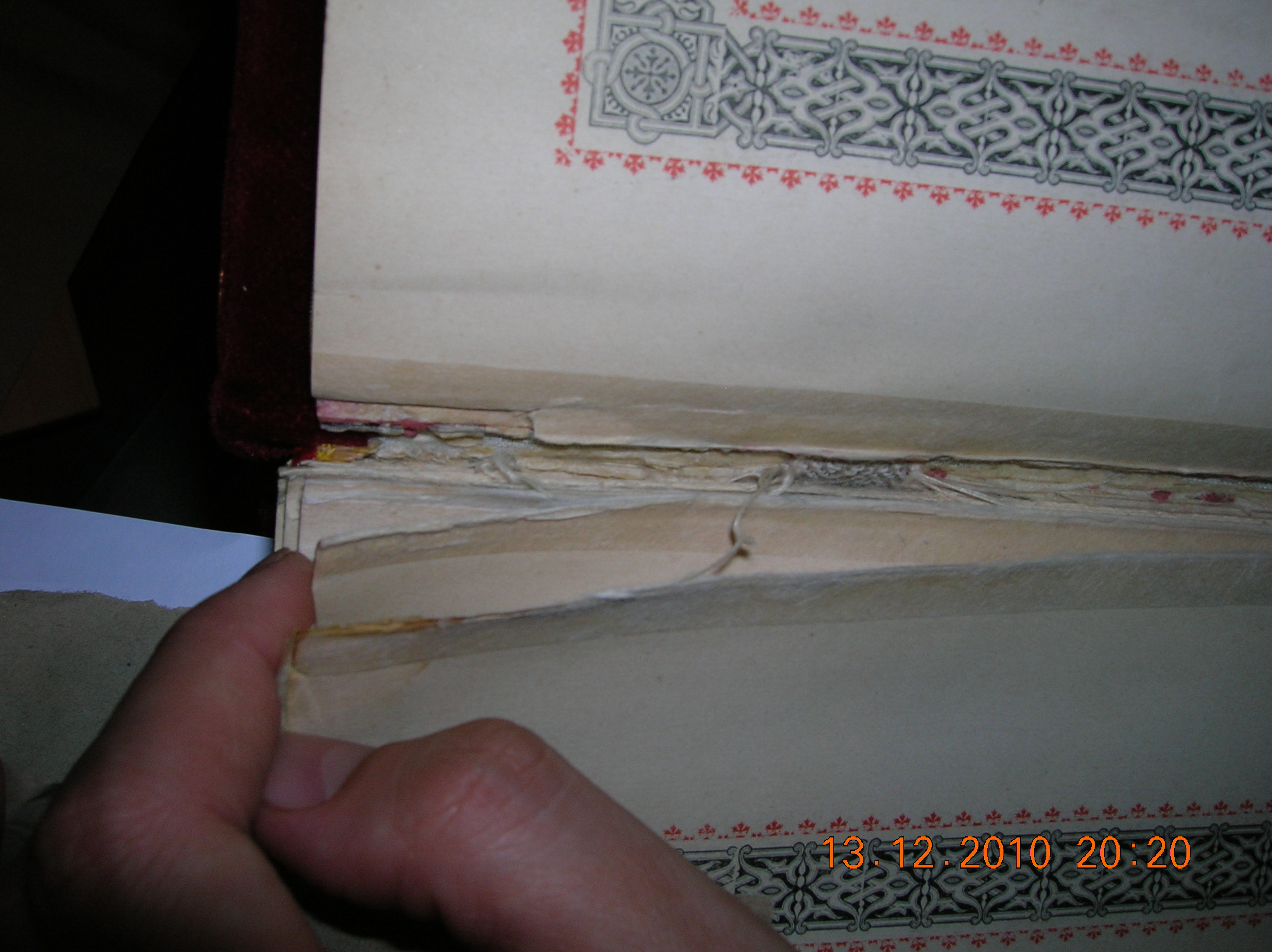 Все-таки фото нужно. Выложите в сообщении несколько крупных планов в области крепления форзаца, шнуров, обреза -все с откинутой верхней крышкой.