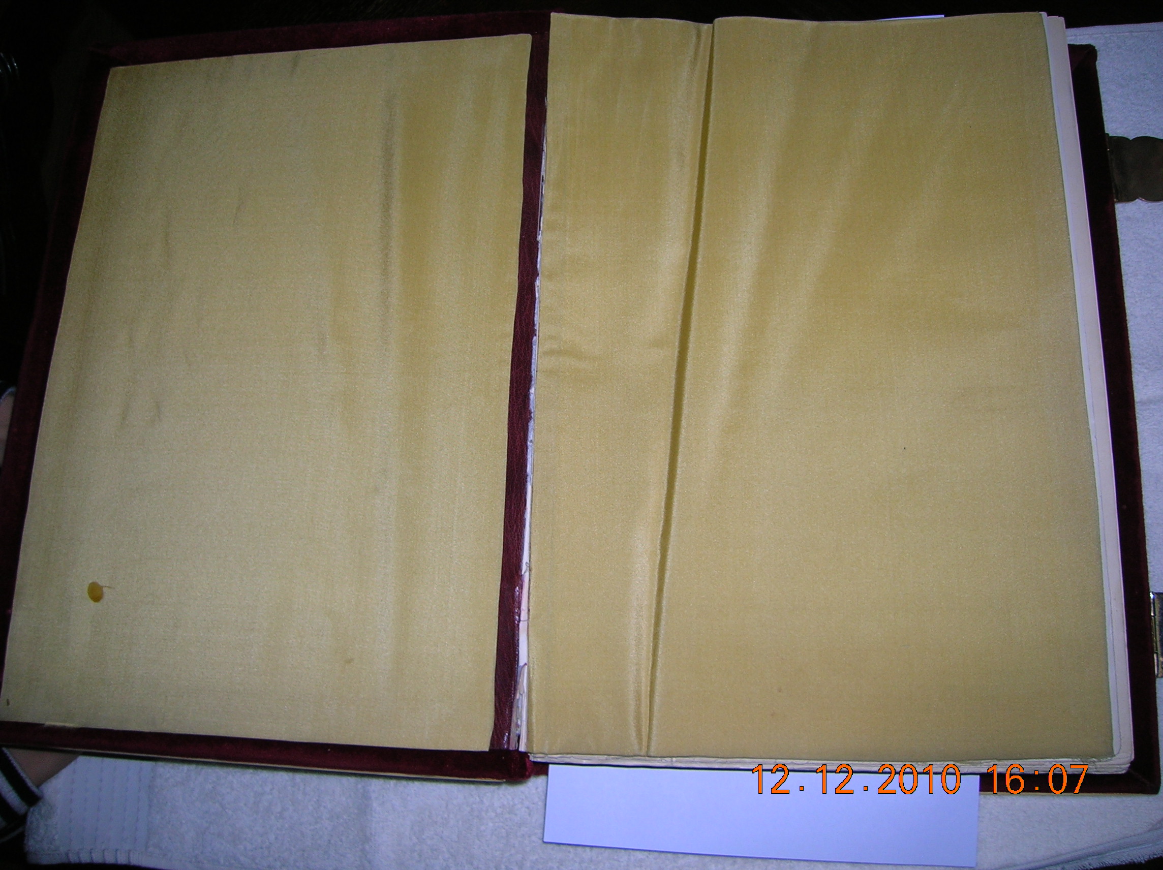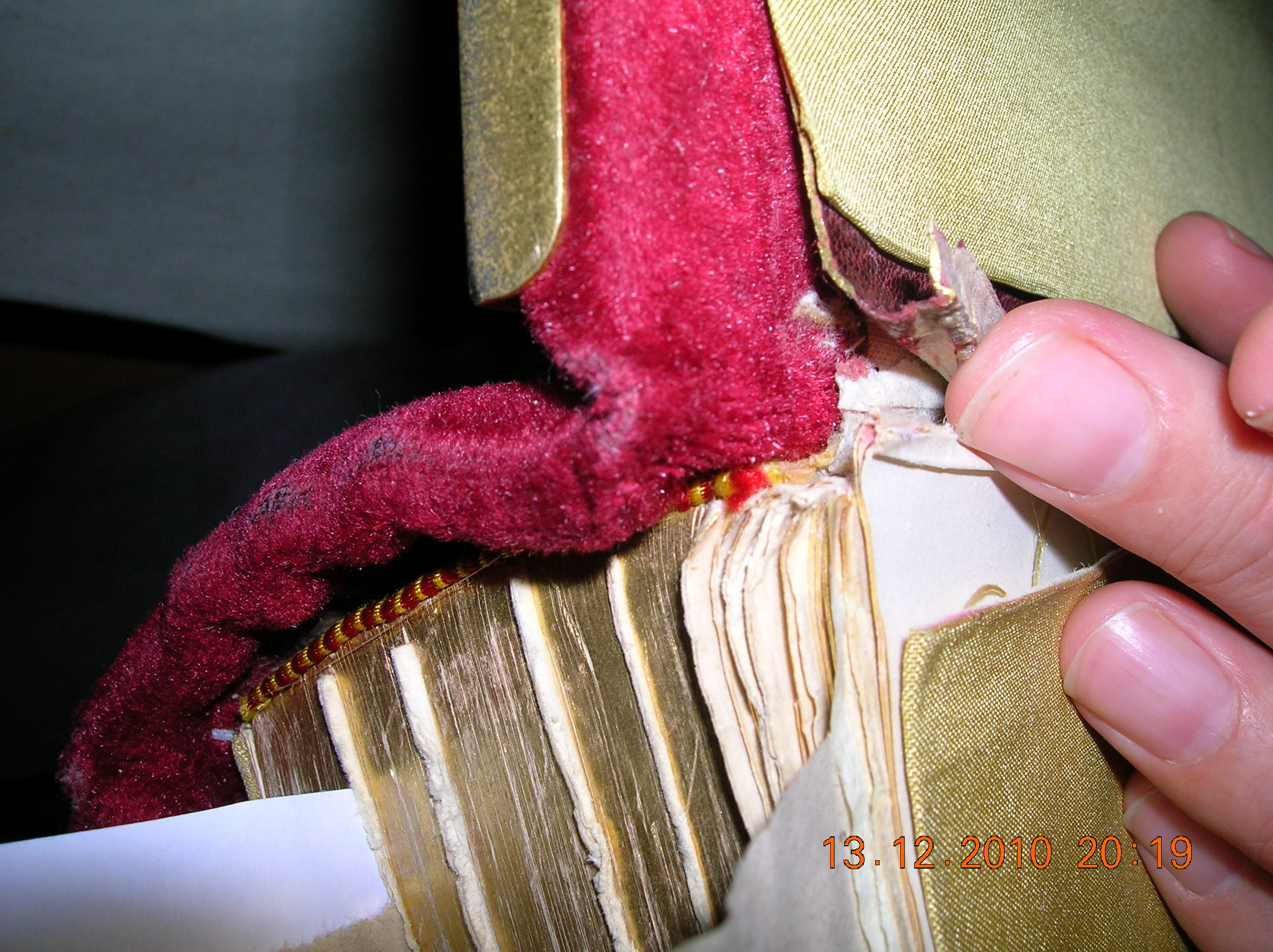 3. Самое сложное - первая тетрадь практически вывалилась. Нитки порваны, листы висят. Вот и вопрос - книгу полностью разбирать и перешивать не возьмусь, нет опыта работы с таким типом переплета (ин фолио, крышки деревянные, обтянуты бархатом, с металлическим окладом). Уверен, что мой случай не единичен, и прошу поделится опытом, как с наименьшими потерями подшить первую тетрадь, не разбирая книгу. Передний форзац - цел, не порван.