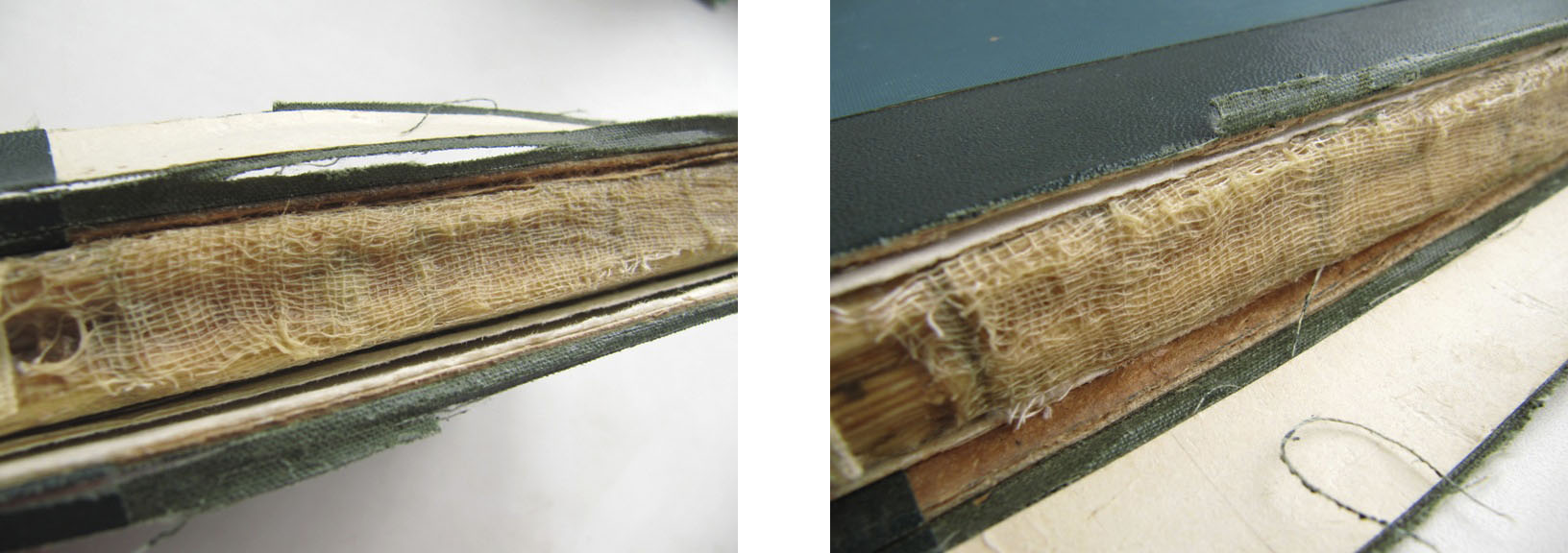 судя по второму снимку, книгу уже перешивали методом "в тачку - на прокол" - там под стрелкой видна стягивающая нить. Если удастся, все такие нити надо перерезать до очистки корешка.