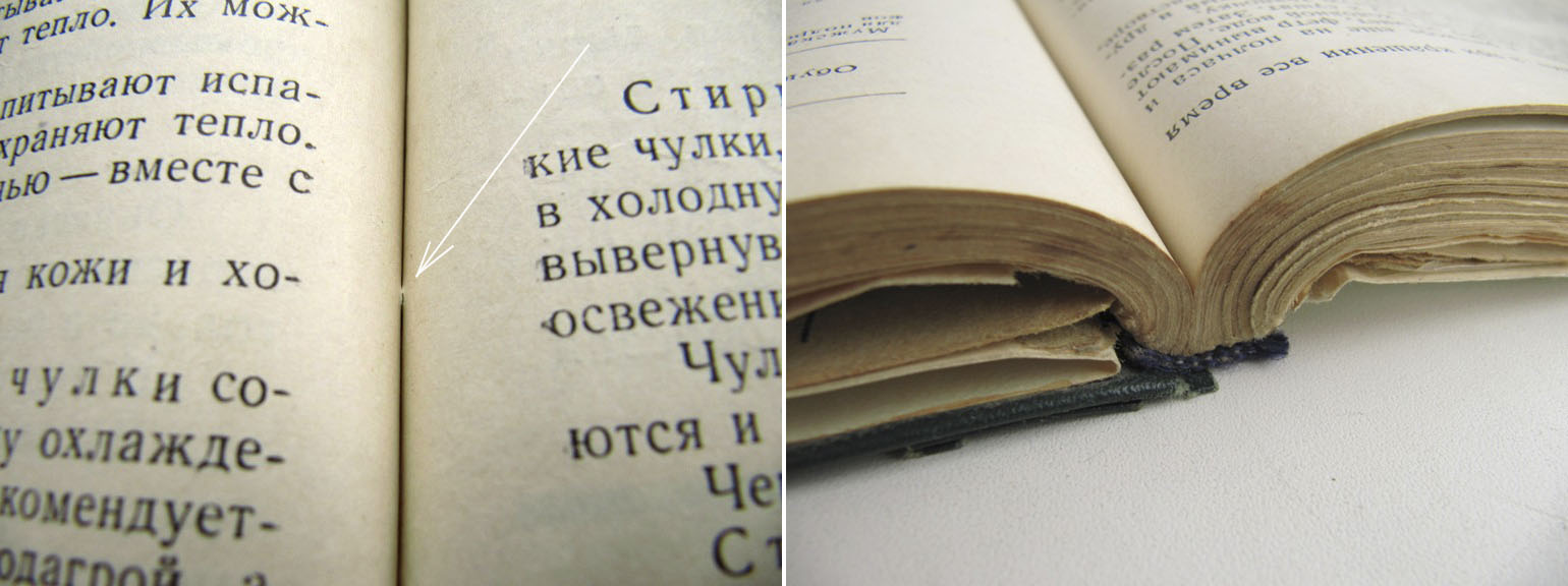 Книга побывала в начале 90-х годов у переплетчика, после чего стала выглядеть весьма аккуратно, но перестала хорошо открываться. Подозреваю, что шилась она насквозь и на совесть - нигде даже намека нет на разрыв нитки.
